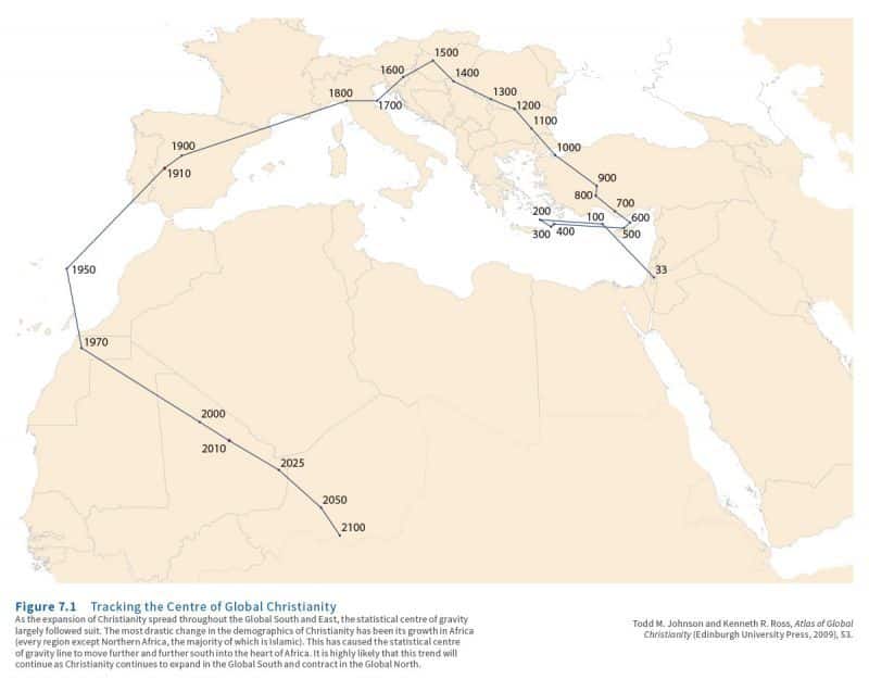Two thousand years ago the Christian church began on the day of Pentecost in the city of Jerusalem. Since then the demographic “center” of Christian populations has made its way across Europe.[1] With the surprising growth of the Christian community globally in the past fifty years, the demographic weight of Christianity in Africa and Asia has pulled this global center south and west. Demographers now place the center of population density of Christians in Africa.