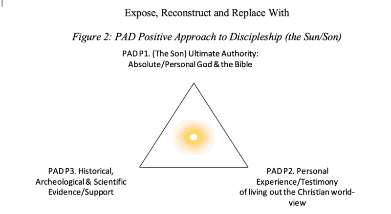 The positive discipleship aspect of PAD (figure 3.1) has three features: (1) PAD primarily appeals to Christianity’s absolute authority – the biblical God and his revealed word. (2) PAD uses the Christian’s testimony and life experience to demonstrate that they are living with no contradiction to their authority. (3) PAD examines historical, archeological, and scientific evidences that attest to the truths found in the authority.