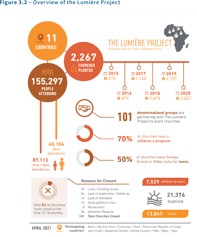 Pastors and evangelists from eleven African nations have risen up to commit themselves to spreading the light of Christ to every corner of their countries. The initiative is called the Lumière Project (lumière means light in French) and was launched by OneHope in 2015, with the goal to see 3,300 new churches planted across French-speaking Africa. To date, 2,267 churches have been planted and more than 155,000 people have attended a service at one of the Lumière churches.[2] From the beginning, research has been strategically embedded into this process, with churches being surveyed at the time they are planted, and then again twelve to eighteen months later. Qualitative research has also been conducted, with fifty-five church planters interviewed in four countries over the course of three years. Through the research, pastors have been able to share their challenges, triumphs, strategies, and the many miraculous ways God is moving in this part of the world.