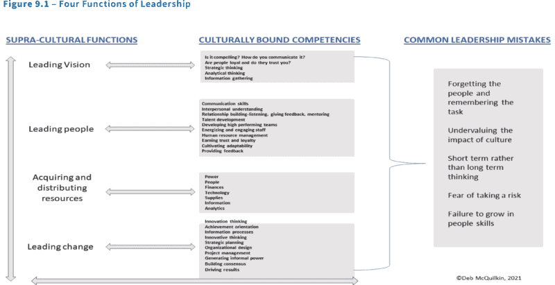 This article and subsequent model below (figure 9.1) identify four functions of leadership that exist regardless of culture and organization and are therefore supra-cultural or above culture.