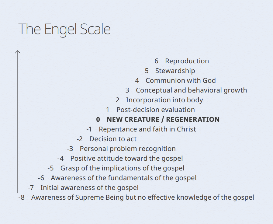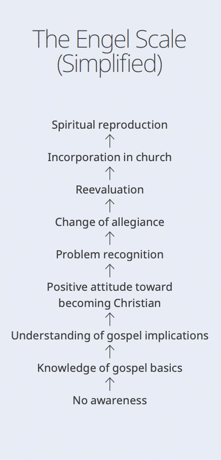 In the early 1970s, James F. Engel developed a helpful scale[10] that can help us determine where to start. The scale describes the journey people experience in their relationship with Christ.