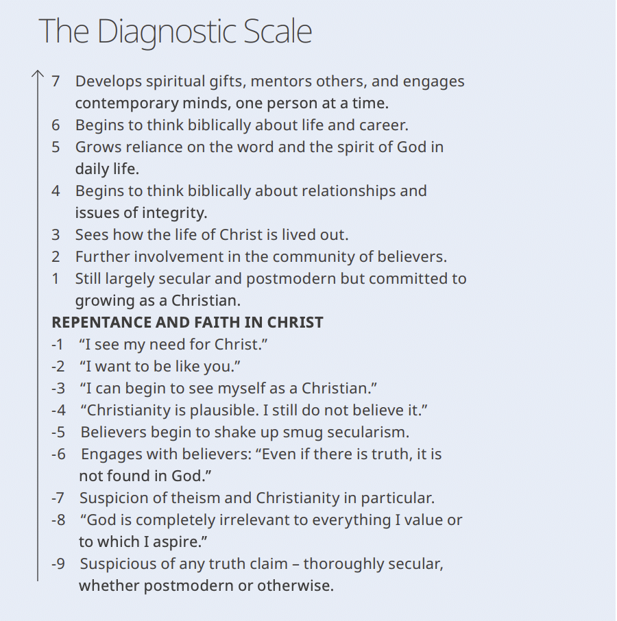 More recently, Gregory Ganssle proposed an updated scale. While based in Engel’s scale, The Diagnostic Scale focuses on what a person sees as valuable, rather than what a person understands. It shows the progression in relation to the influences and the ideas that a person goes through in the conversion journey (including the moment of repentance and faith in Christ).