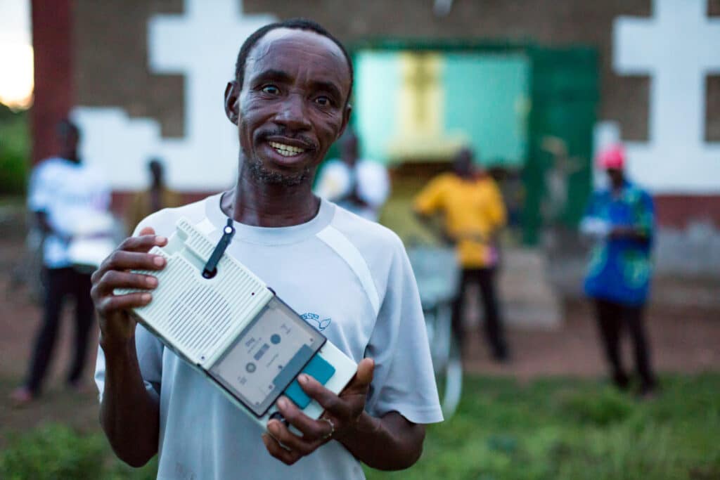 Jugboi, Ghana: Godwin Kwaku holds a Talk Tape II that a listening-group of believers use to hear the Deg scriptures during their weekly Bible study. Photo by Rodney Ballard. Courtesy of WGA.