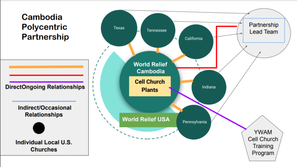 The final partnering entity was a YWAM ministry already working locally with WR-Cambodia to develop leaders from the Khmer people for the emerging cell churches. This leadership development piece was their singular though essential contribution to our collaborative effort. As an exception to our overall polycentric process, the YWAM program minimally and only indirectly interacted with the US church partners.
